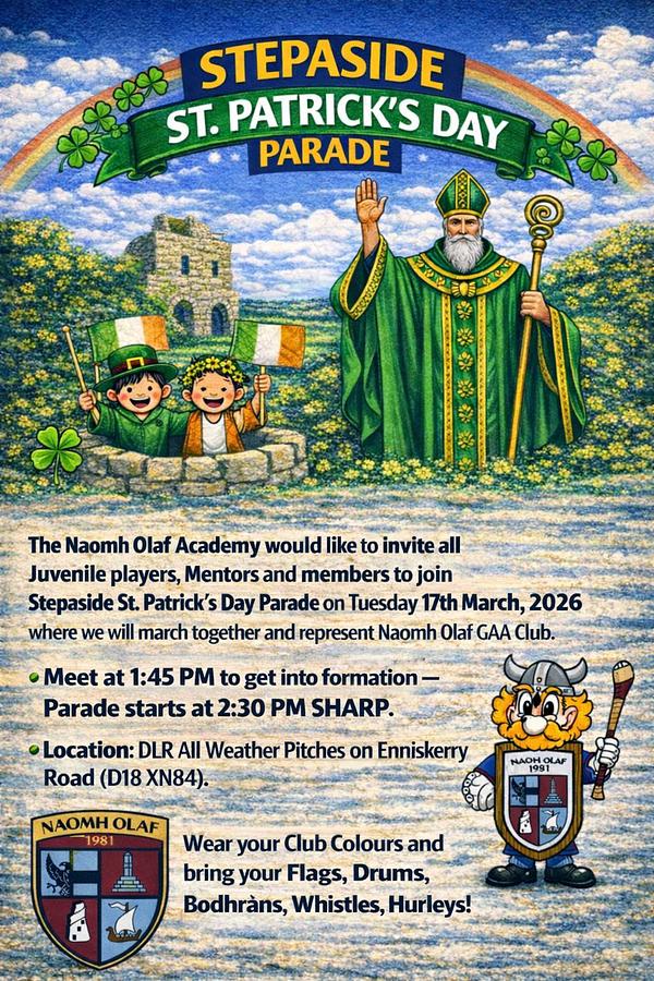 The Naomh Olaf Academy would like to invite all Juvenile Players, Mentors and members to join the Stepaside Parade on Tuesday 17th March, where we will march together and represent our club!