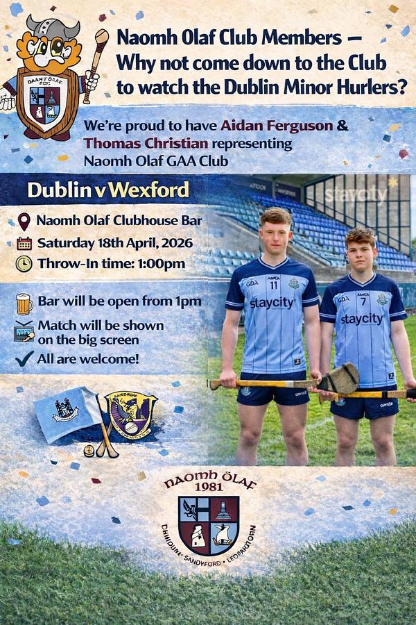 We would like to encourage all members to support the Dublin minor hurlers this weekend in Parnell Park. Both Aidan Ferguson & Thomas Christian are on the panel.