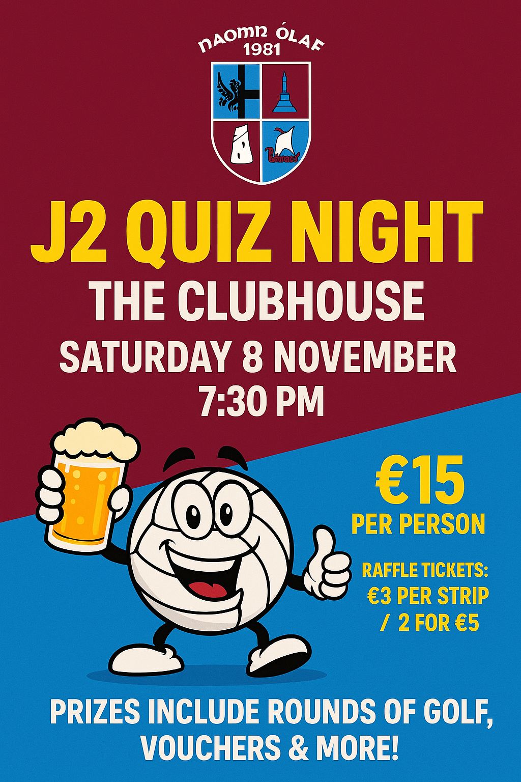Fundraiser for Mens J2 Team, Saturday 8th of November in Olafs Clubhouse, Starts at 7.30pm. Tickets are €15 per person